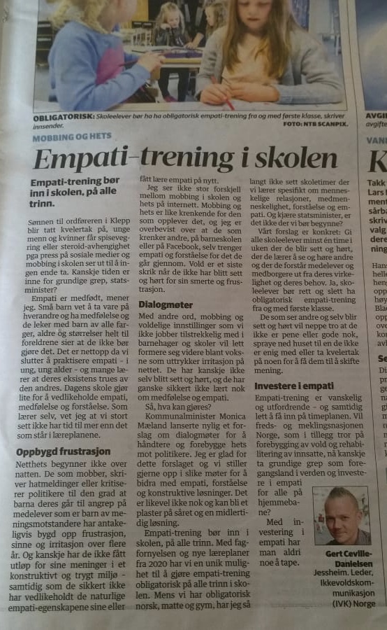 Empati-trening bør inn i skolen, på alle trinn! Med fagfornyelsen og nye læreplaner fra 2020 har vi en unik mulighet til å gjøre empati-trening obligatorisk på alle trinn i skolen. Mens vi har obligatorisk norsk, matte og gym, har jeg så langt ikke sett skoletimer der vi lærer spesifikt om menneskelige relasjoner, medmenneskelighet, forståelse og empati. Og kjære statsminister, er det ikke der vi bør begynne?